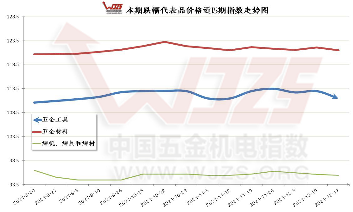 | 核心提示:本期价格指数收于108.09下跌0.11点,同比上涨6.80%。12大类呈“2涨3跌7平”态势。本期涨幅类产品是:【电线电缆】【五金零部件】;本期下跌指数类产品,是【五金工具】【五金材料】【焊机、焊具和焊材】…… |